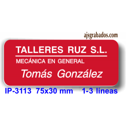 IP-3133 placa de solapa para identificación en acrílico texturizado rojo, medida 75x30 mm grueso 1,5 grabada en bajo relieve texto y orla blanca, lleva un imperdible en la parte posterior, modelo para 1 a 3 líneas con 25 caracteres la mayor. En personalización escriba por líneas el texto a grabar y revíselo Hacer cambios y aclaraciones ver Más, finalice con GUARDAR y añadir al carrito.
